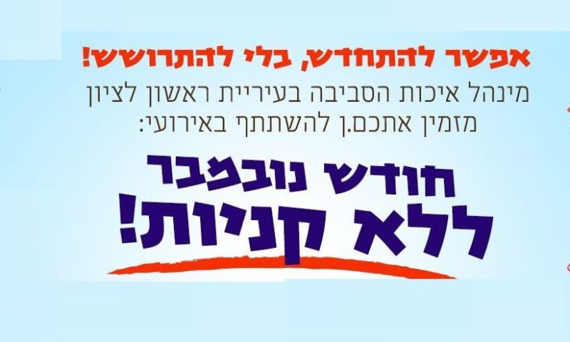 עיריית ראשון לציון מציינת החודש את "חודש נובמבר ללא קניות!", עם שלל פעילויות סביבתיות שיתקיימו במהלך החודש. בהובלת מינהל איכות הסביבה, יתקיימו אירועים לצעירים, מבוגרים, נוער ומשפחות ברחבי העיר, ללא עלות או בעלות סמלית בלבד, במטרה להטמיע הרגלים סביבתיים ולקדם ערכים של שמירה על הסביבה, צמצום פסולת והפחתת צריכה.